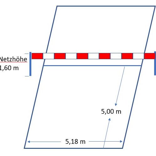 Die Breite des Feldes ist 5,18 Meter. Somit können die Innenlinien der vielfach in den Hallen vorhandenen Badminton-Felder genutzt werden.
